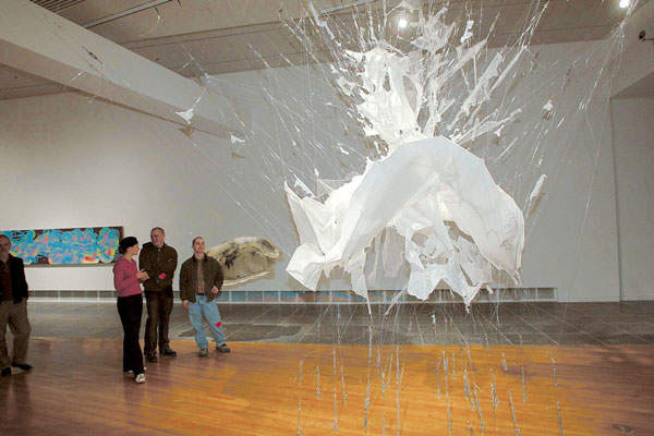 Because a lot of the poems in Six Portraits are about art, the way the book looked was really important to me. I’d always imagined the cover of my first book being Bombshell, this incredible sculpture by the artist E.V. Day. Made of fishing line, turnbuckles, and fabric, the sculpture looks like Marilyn Monroe’s white dress blowing up in The Seven-Year Itch—if Marilyn Monroe’s dress had exploded. My poem, also titled Bombshell, is shaped to look like the sculpture. I had first seen the work in The Wexner Center for the Arts on the Ohio State campus, but it’s now owned by the Whitney Museum. Margo Stever, co-editor of Slapering Hol, was tremendous in working with E.V. Day to get permission to use the image, which E.V. Day graciously donated.